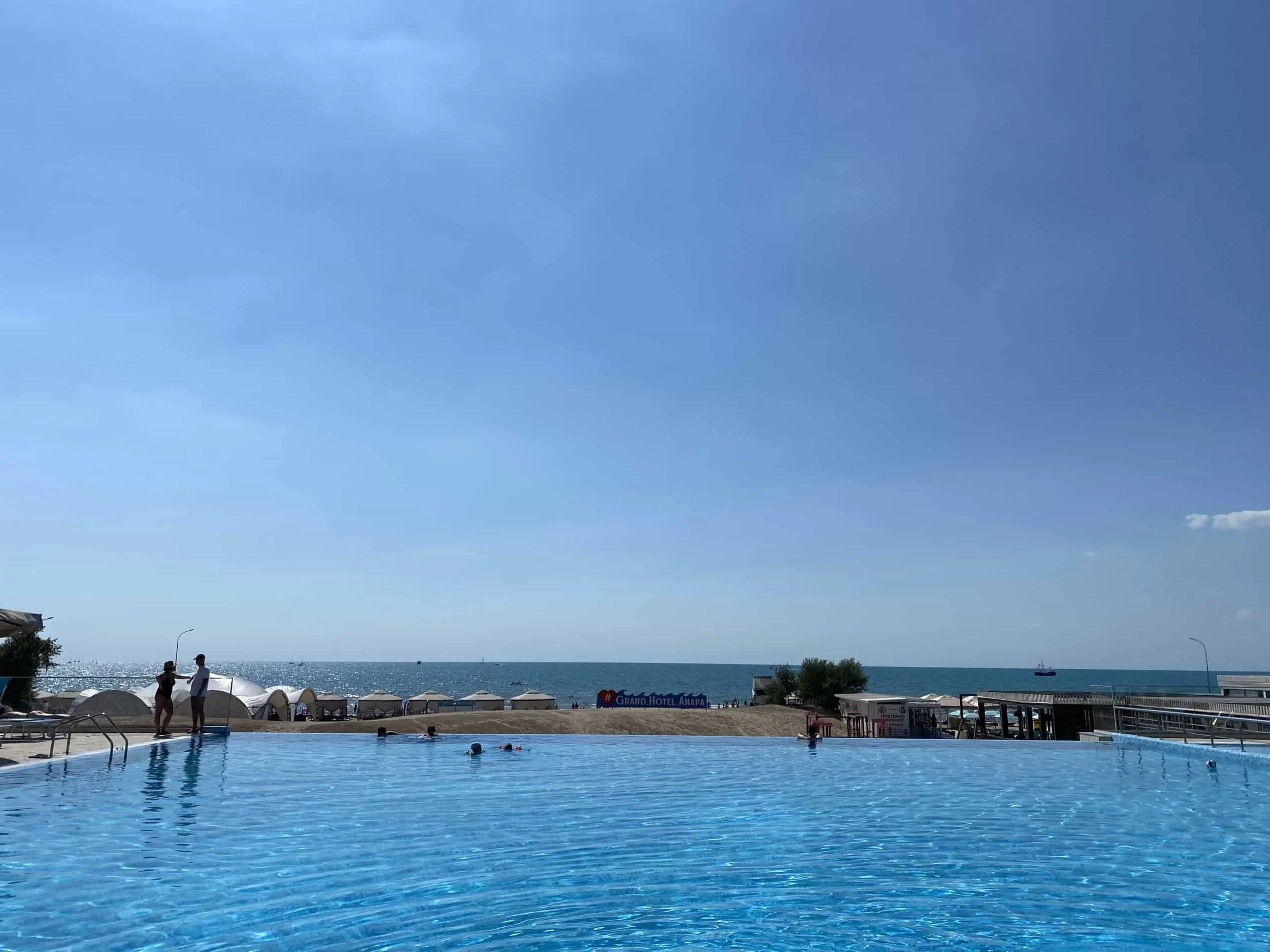 Плавные изгибы вписанного в природный ландшафт инфинити бассейна с видом на море не оставят равнодушными ни одного гостя Гранд Отель Анапа.