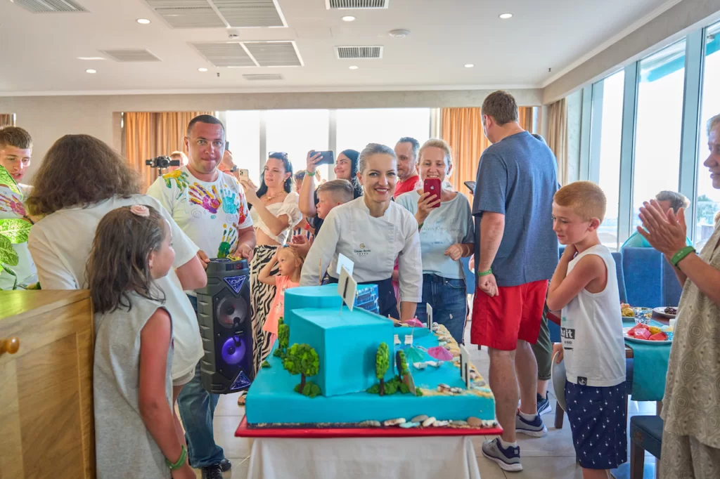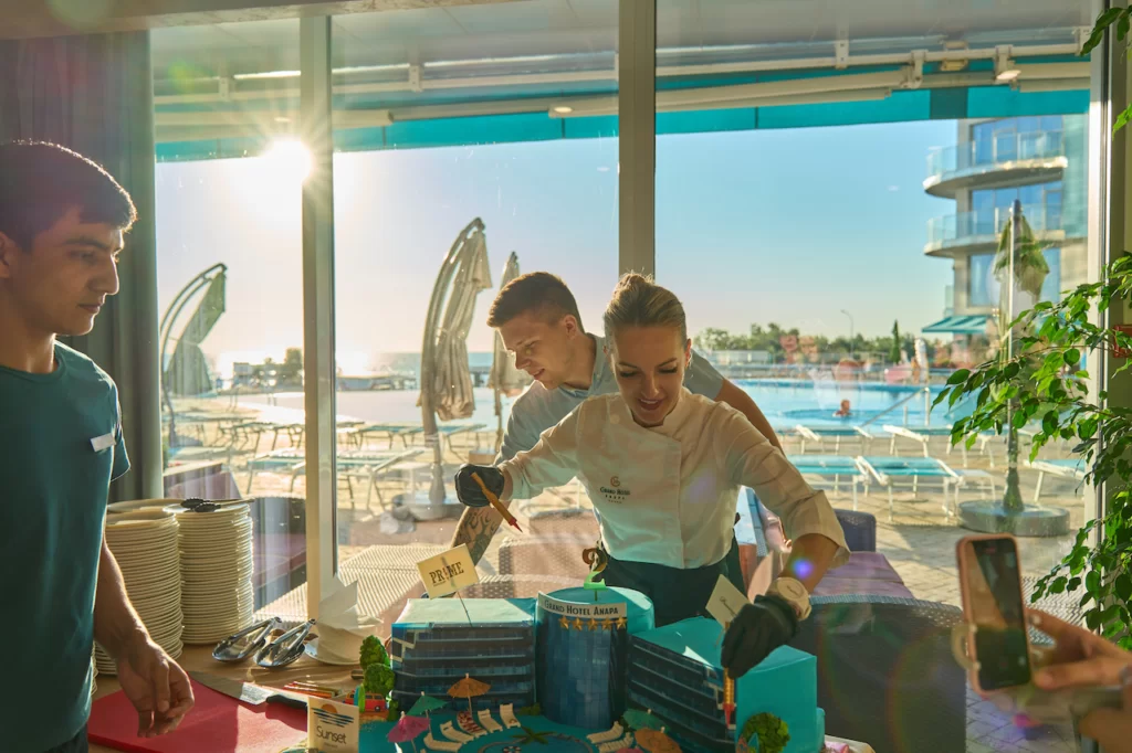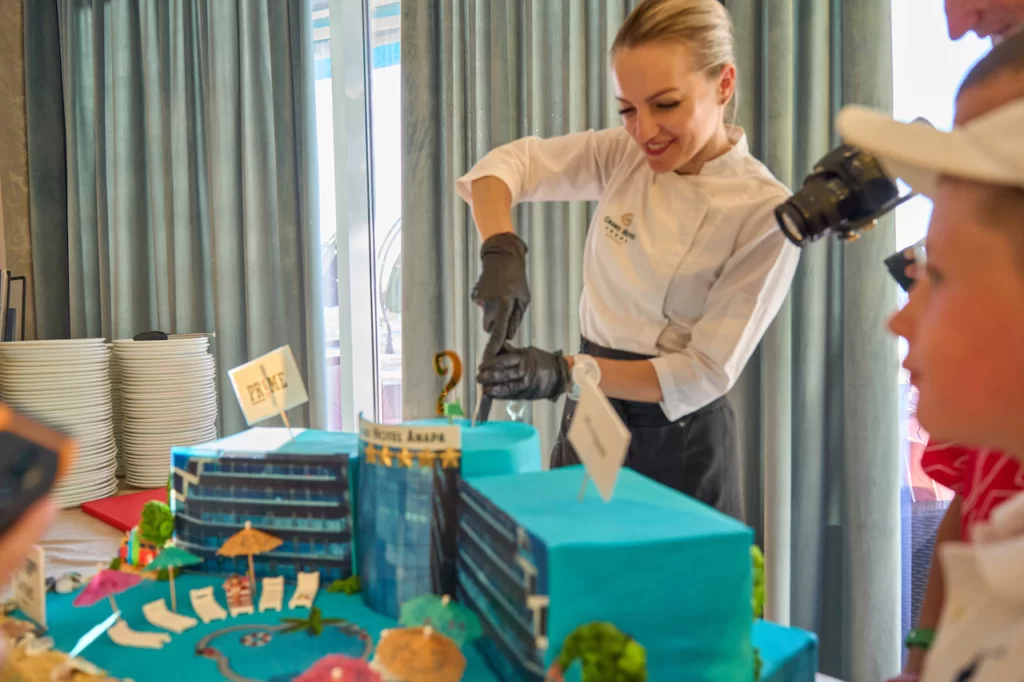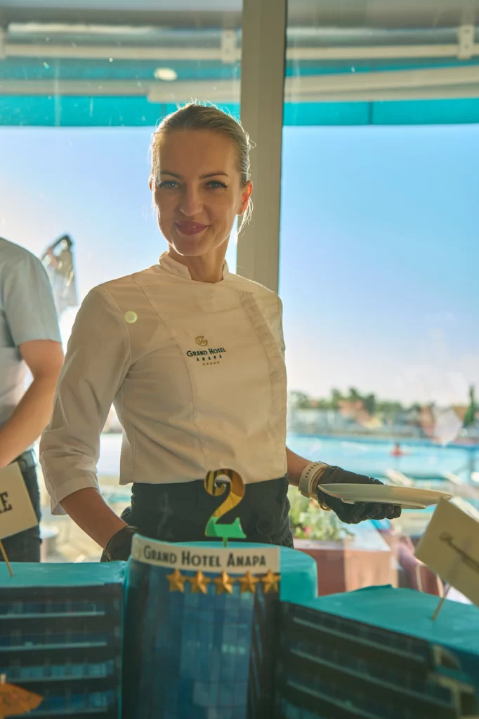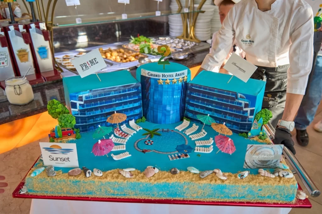 Во время ужина в ресторане «шведской линии» Panorama шеф-кондитер Татьяна Лазарец вместе с коллегами торжественно выкатила праздничный 35-ти килограммовый торт в форме курорта Grand Hotel Anapa.