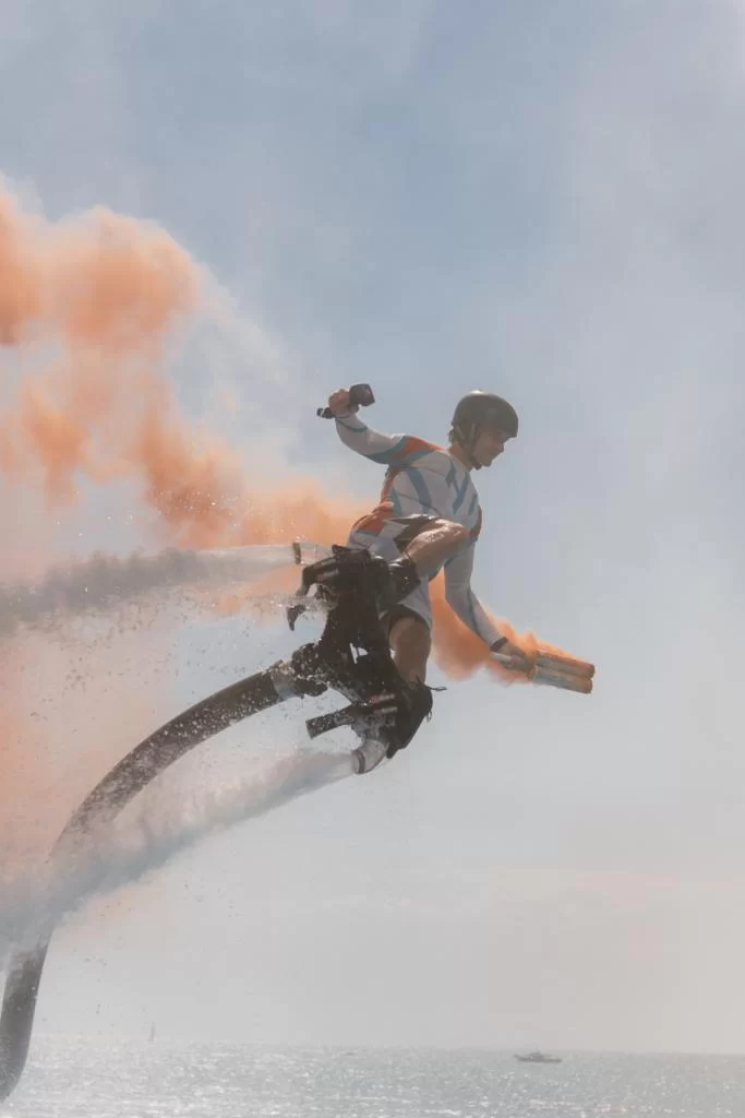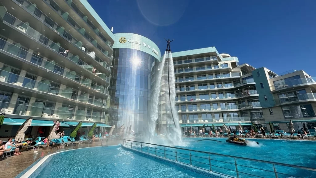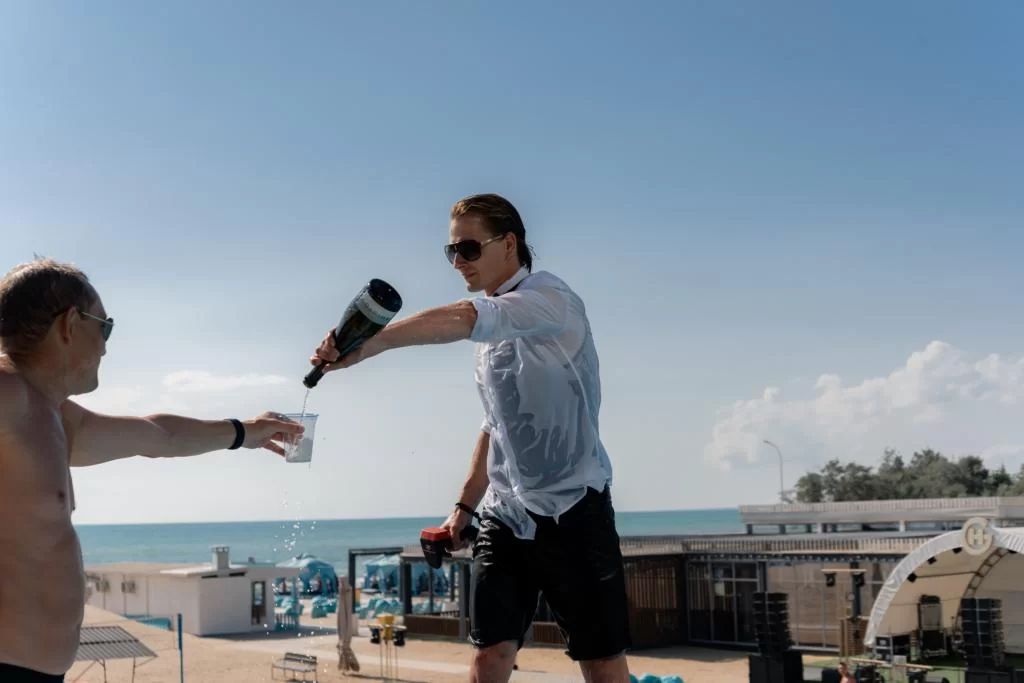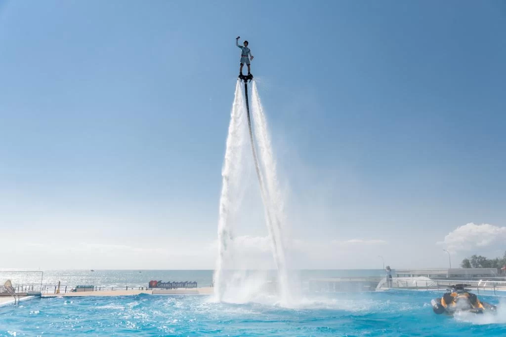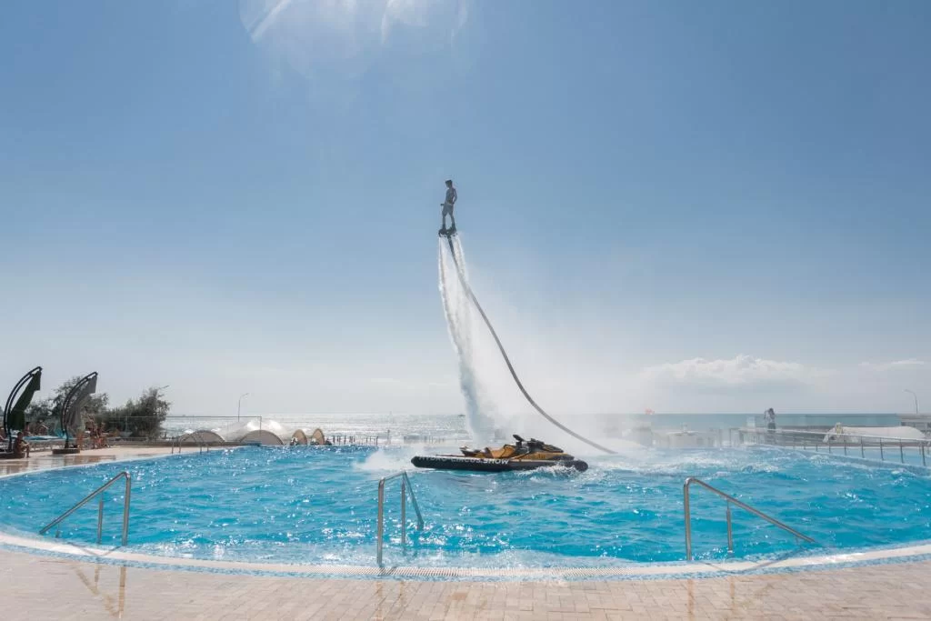 После великолепного обеда гости Гранд Отель Анапа стали свидетелями уникального цирка на воде при участии флайбордиста. Трюки и танцы, брызги и катание гостей оставили невероятные впечатления у всех присутствующих.