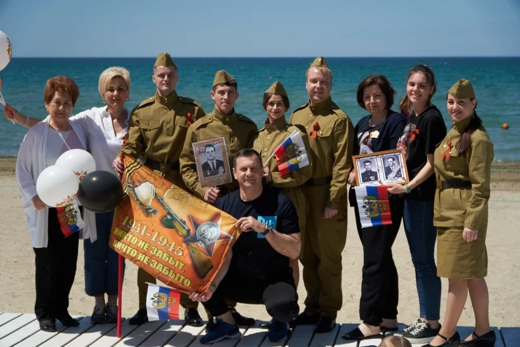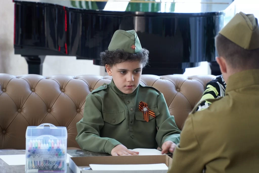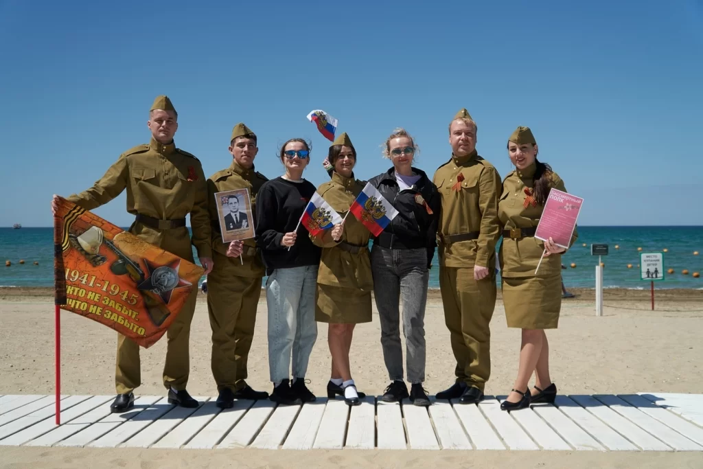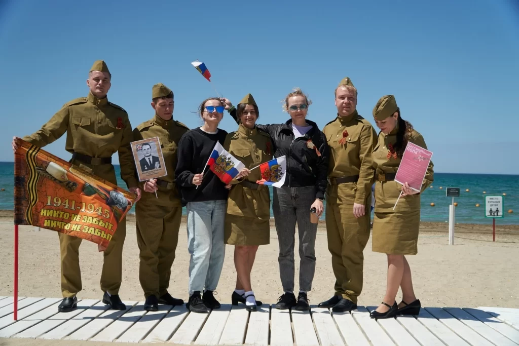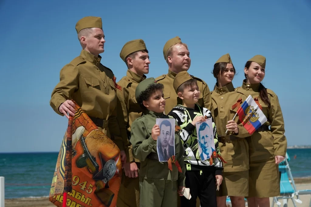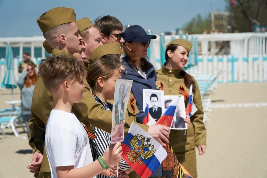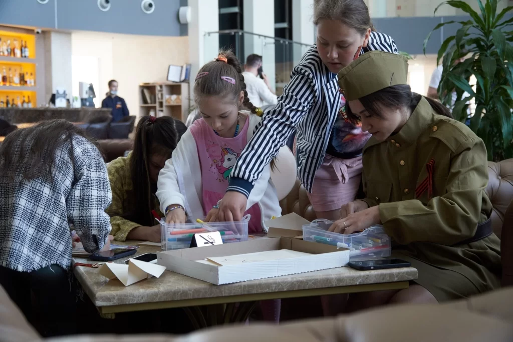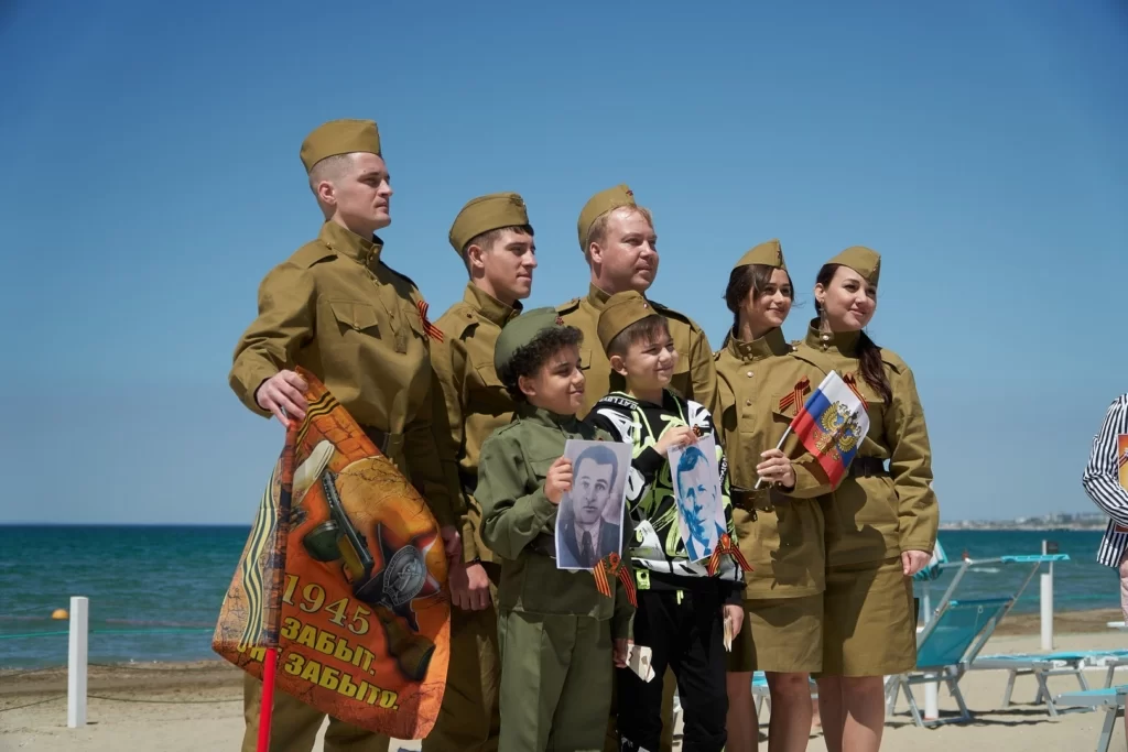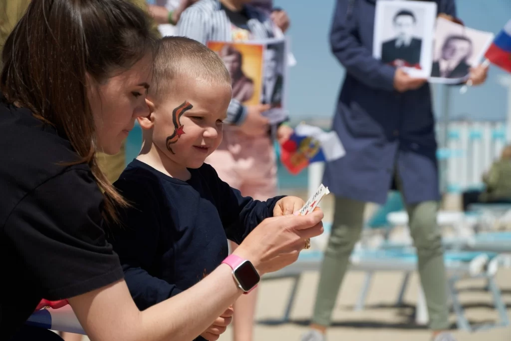 С раннего утра в атриуме юные гости вместе с родителями, бабушками и дедушками делали памятные значки, самолетики, подпевали знаменитым песням военных лет, а в полдень вместе прошли к берегу моря вместе с фотографиями своих родственников, участвовавших в Великой Отечественной войне.