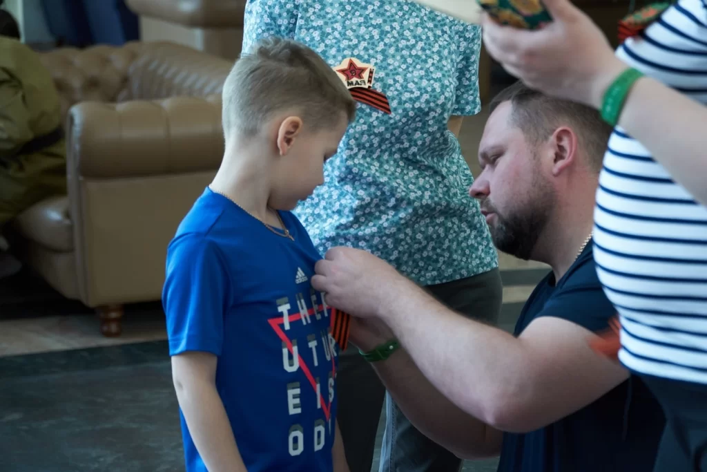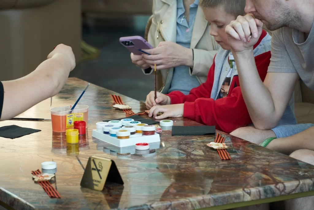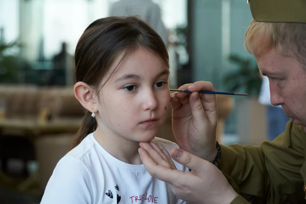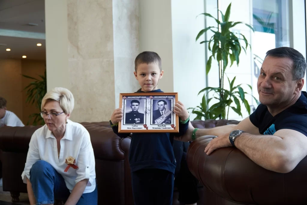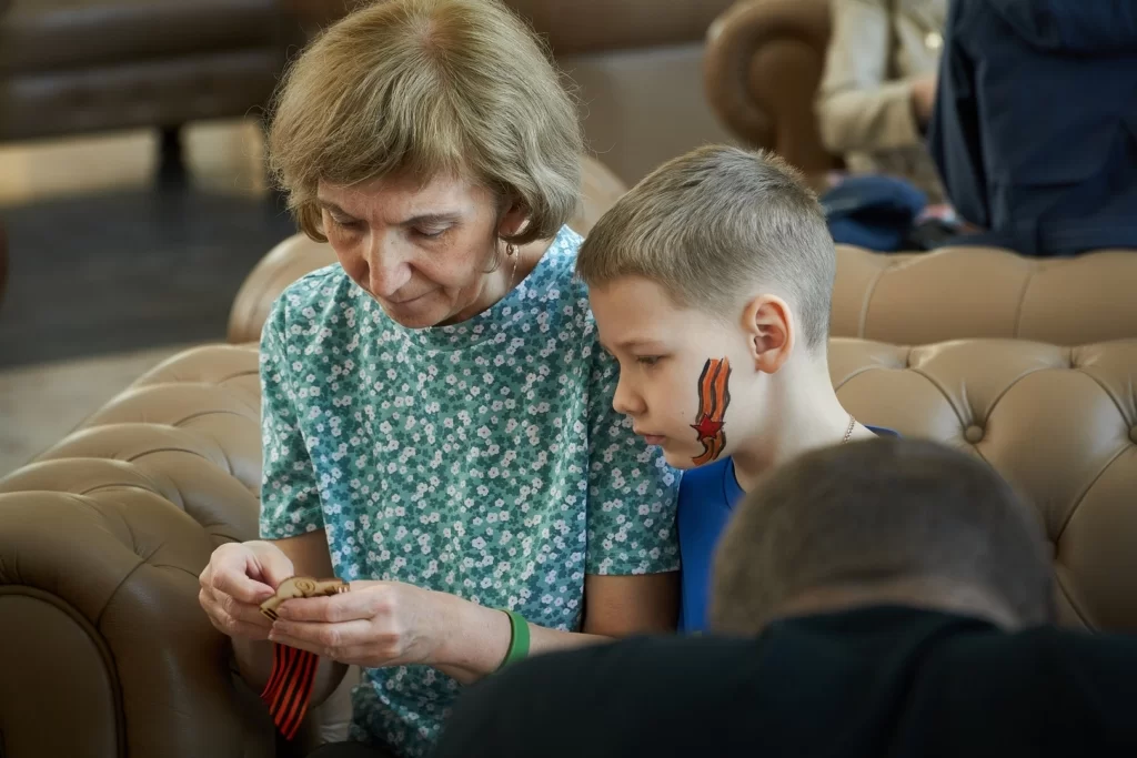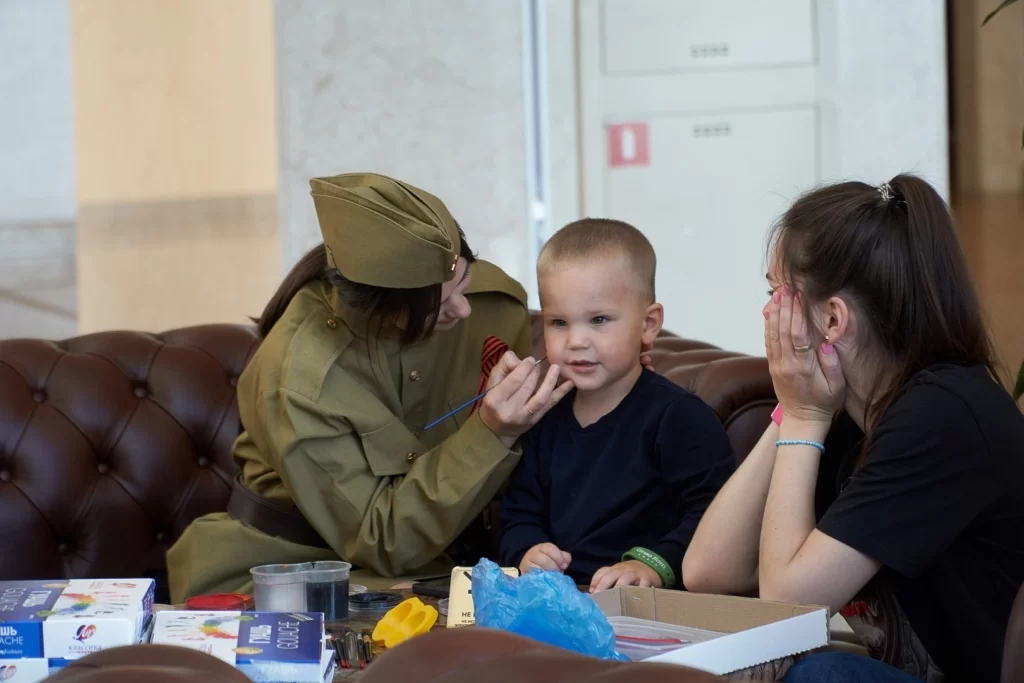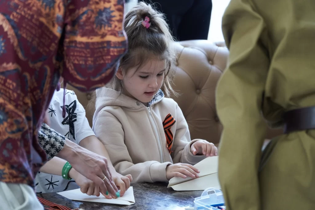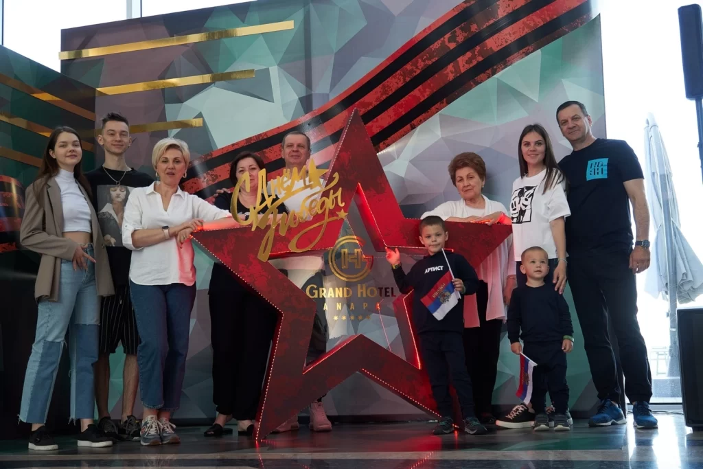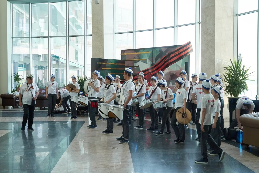 С раннего утра в атриуме юные гости вместе с родителями, бабушками и дедушками делали памятные значки, самолетики, подпевали знаменитым песням военных лет, а в полдень вместе прошли к берегу моря вместе с фотографиями своих родственников, участвовавших в Великой Отечественной войне.