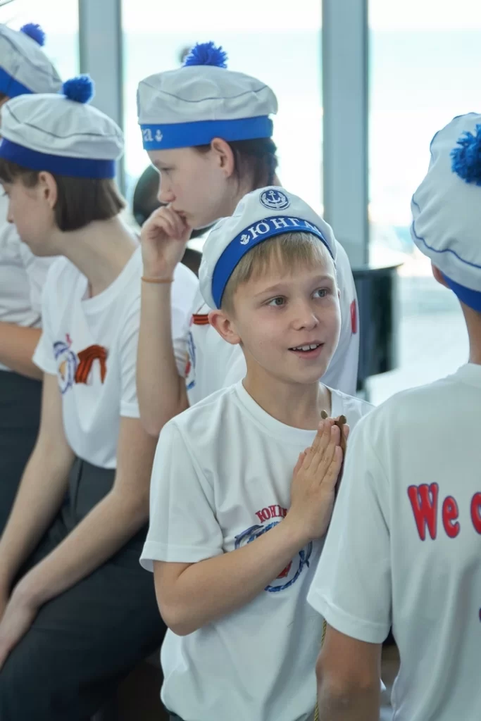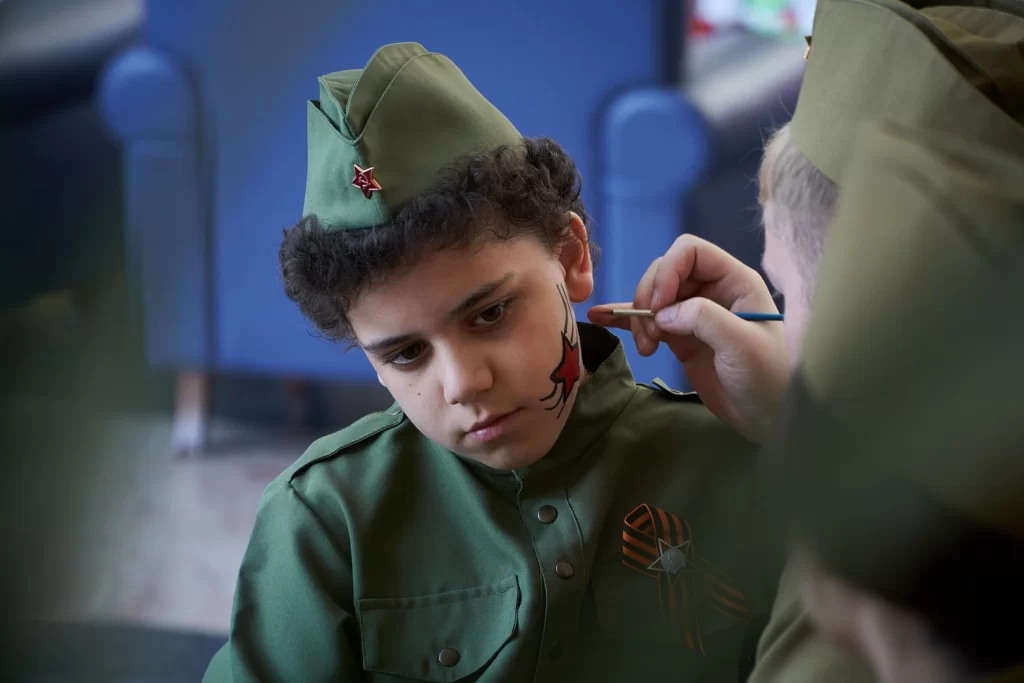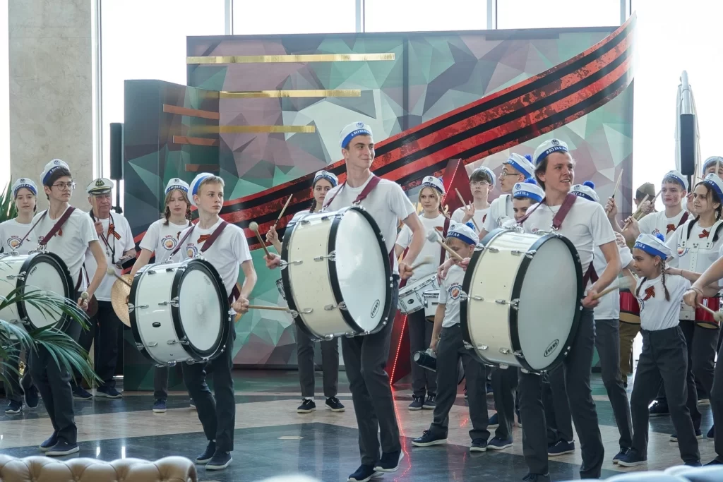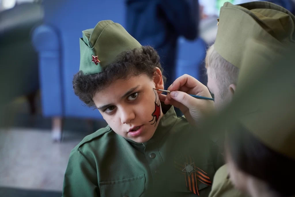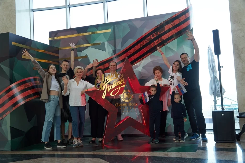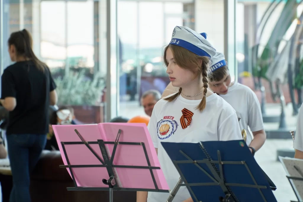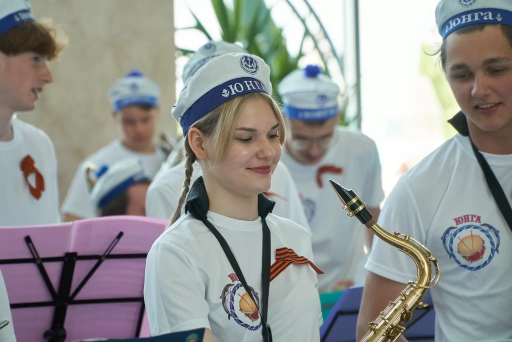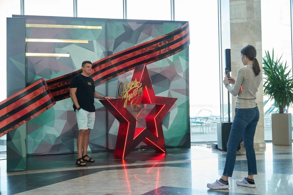 С раннего утра в атриуме юные гости вместе с родителями, бабушками и дедушками делали памятные значки, самолетики, подпевали знаменитым песням военных лет, а в полдень вместе прошли к берегу моря вместе с фотографиями своих родственников, участвовавших в Великой Отечественной войне.