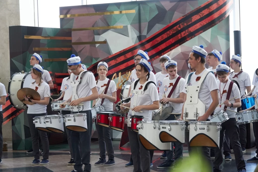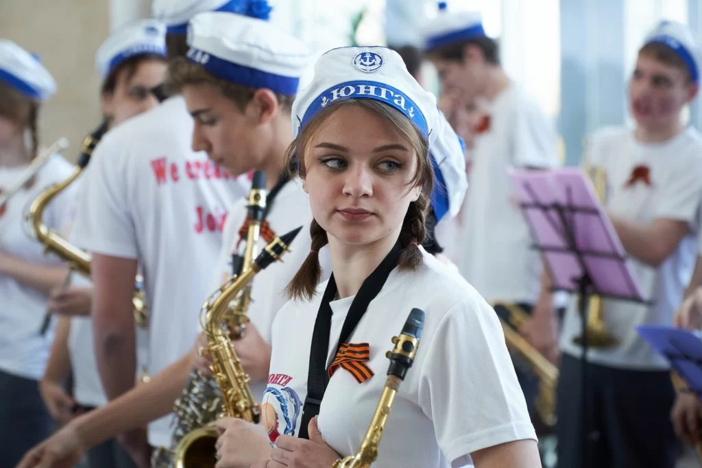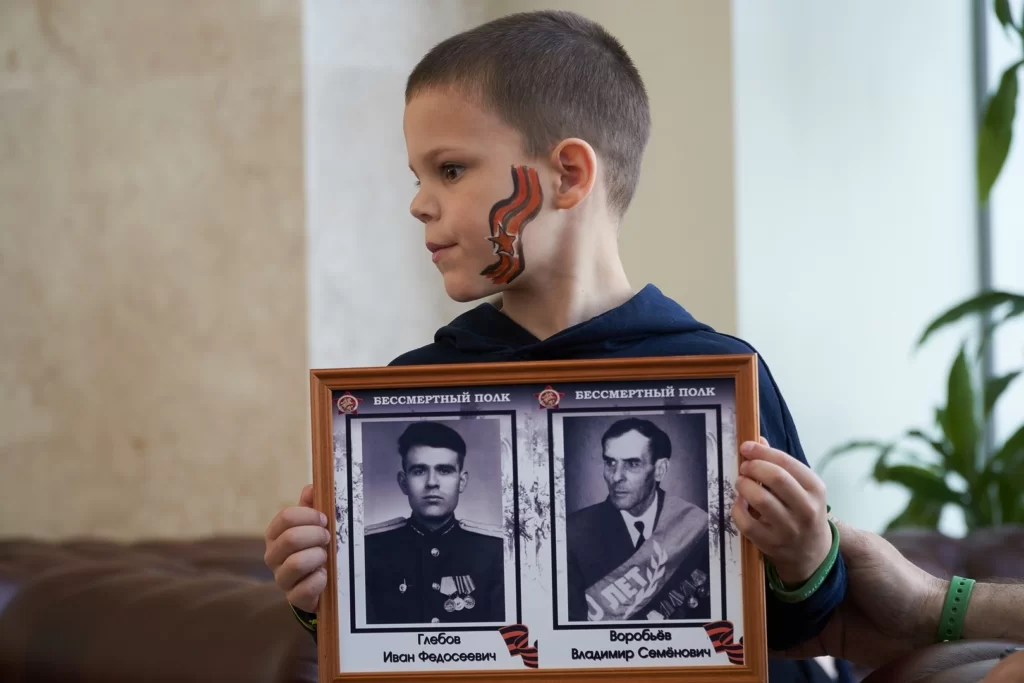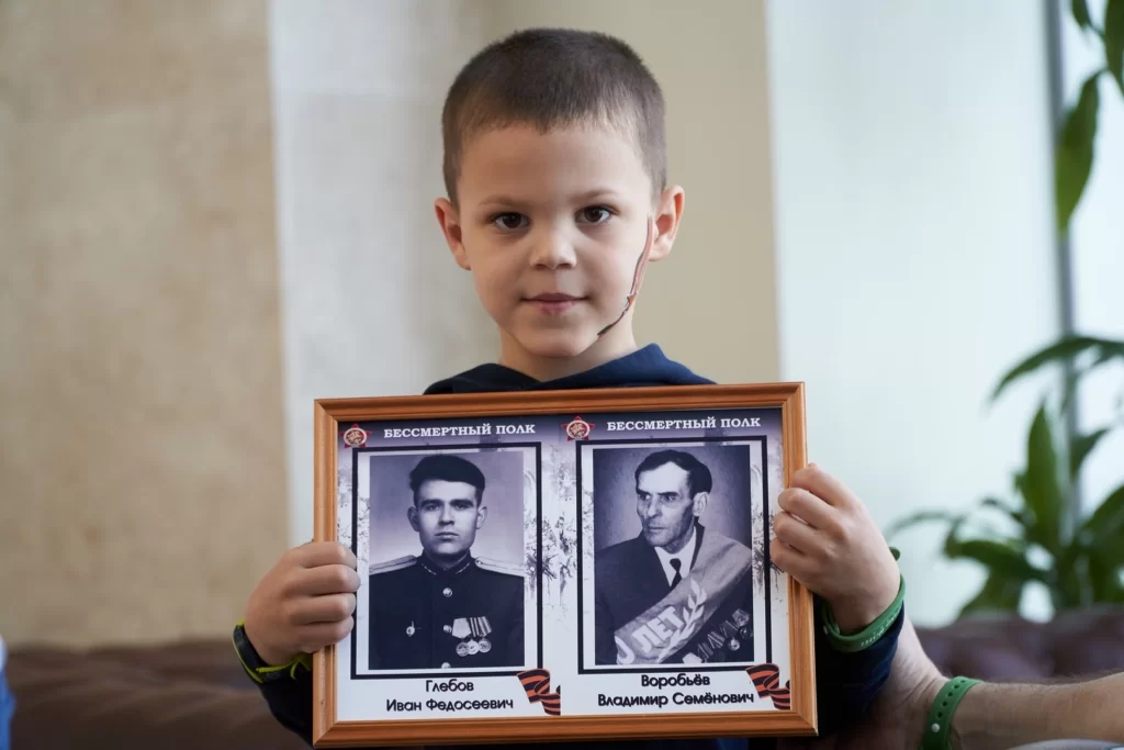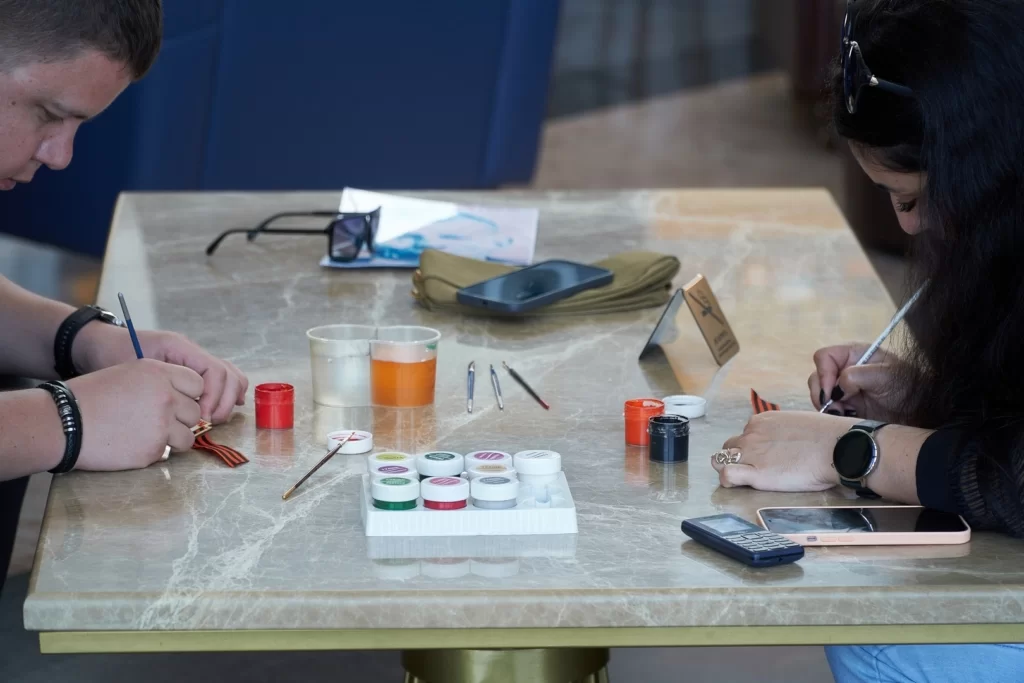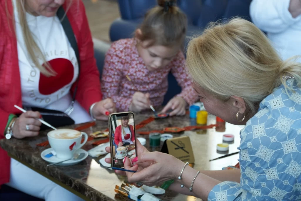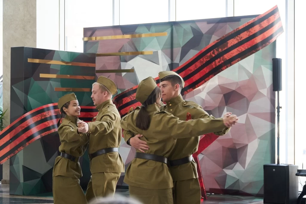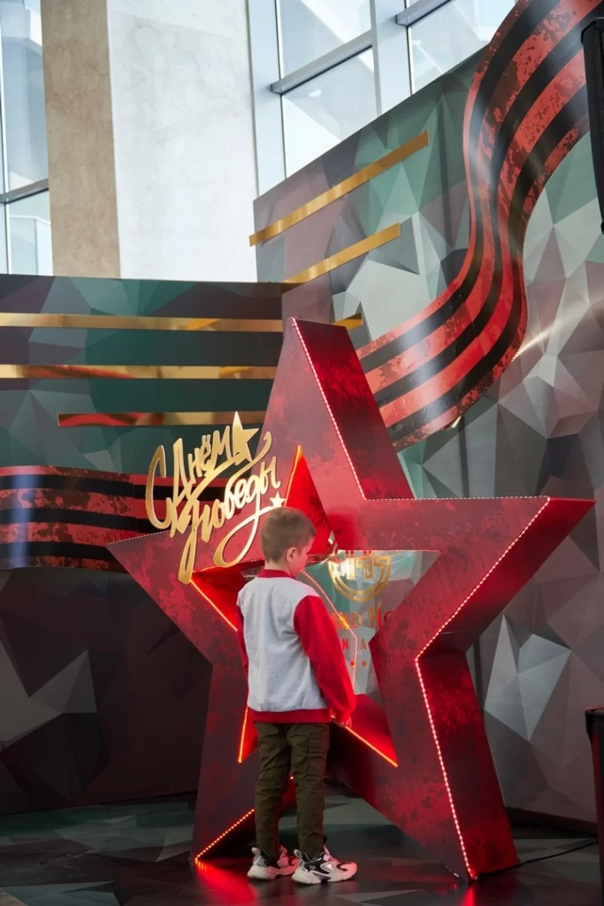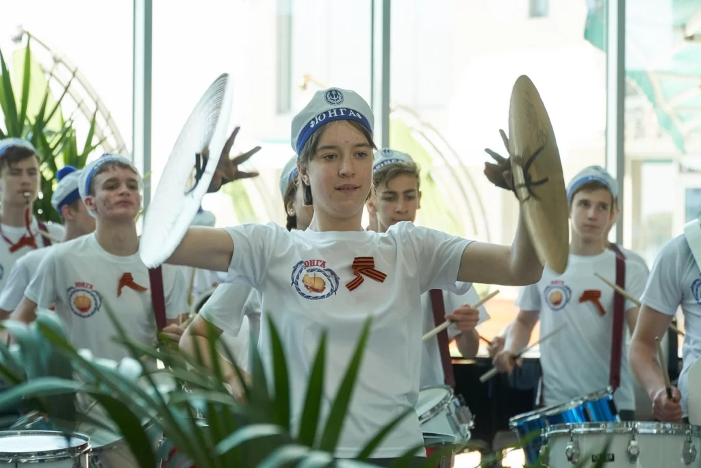 С раннего утра в атриуме юные гости вместе с родителями, бабушками и дедушками делали памятные значки, самолетики, подпевали знаменитым песням военных лет, а в полдень вместе прошли к берегу моря вместе с фотографиями своих родственников, участвовавших в Великой Отечественной войне.