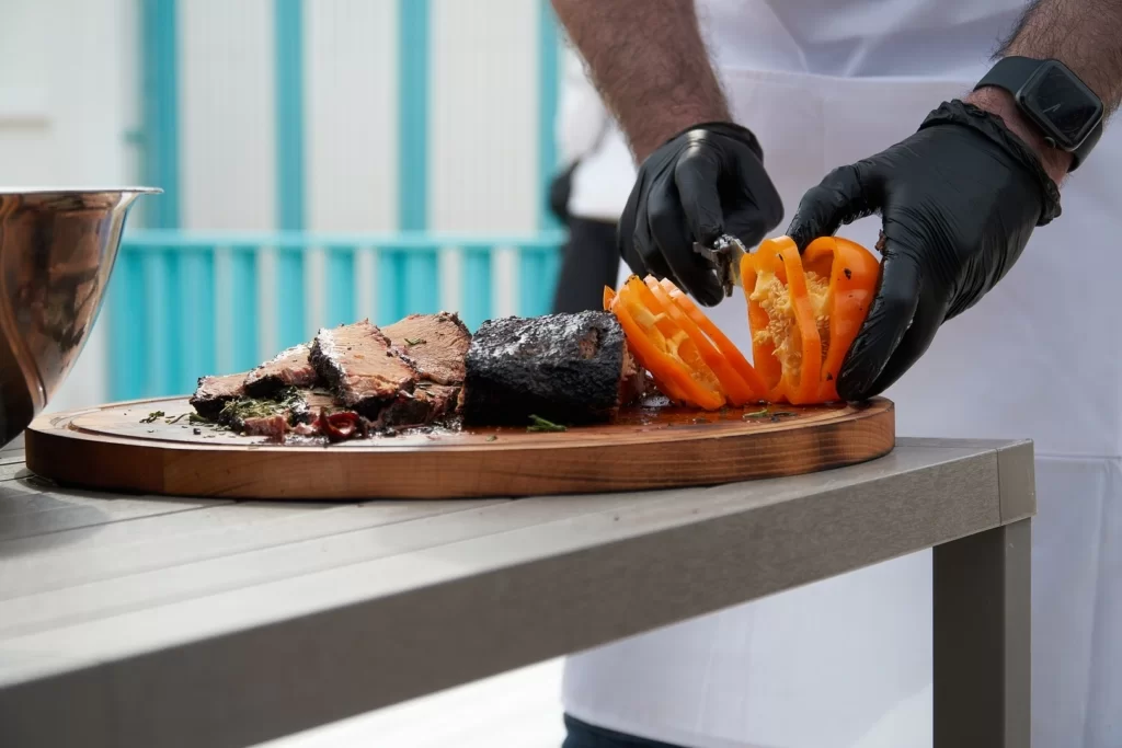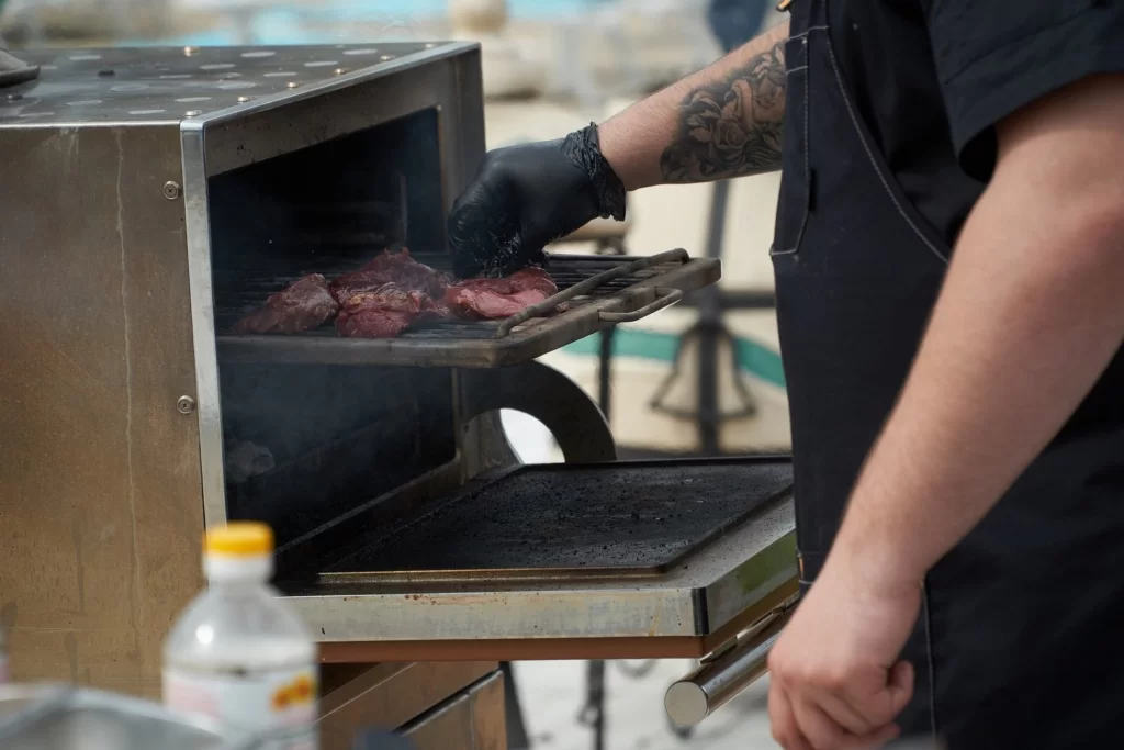 Мясо, рыба, овощи запекались, жарились нон-стоп в хоспере, тандыре, на мангале, а также в гигантском смокер-гриле.