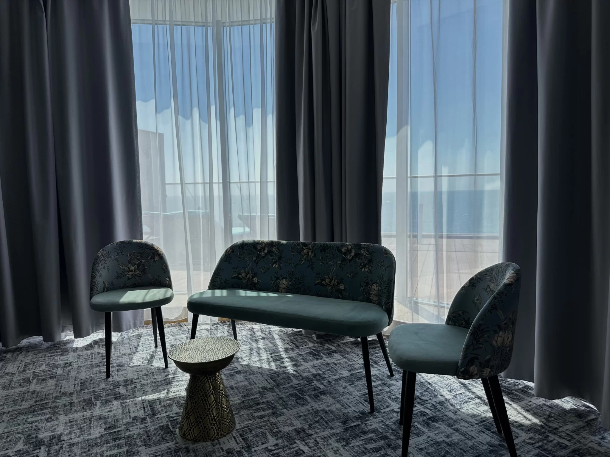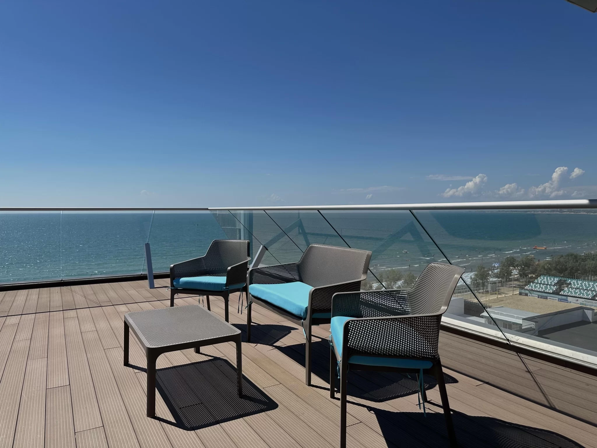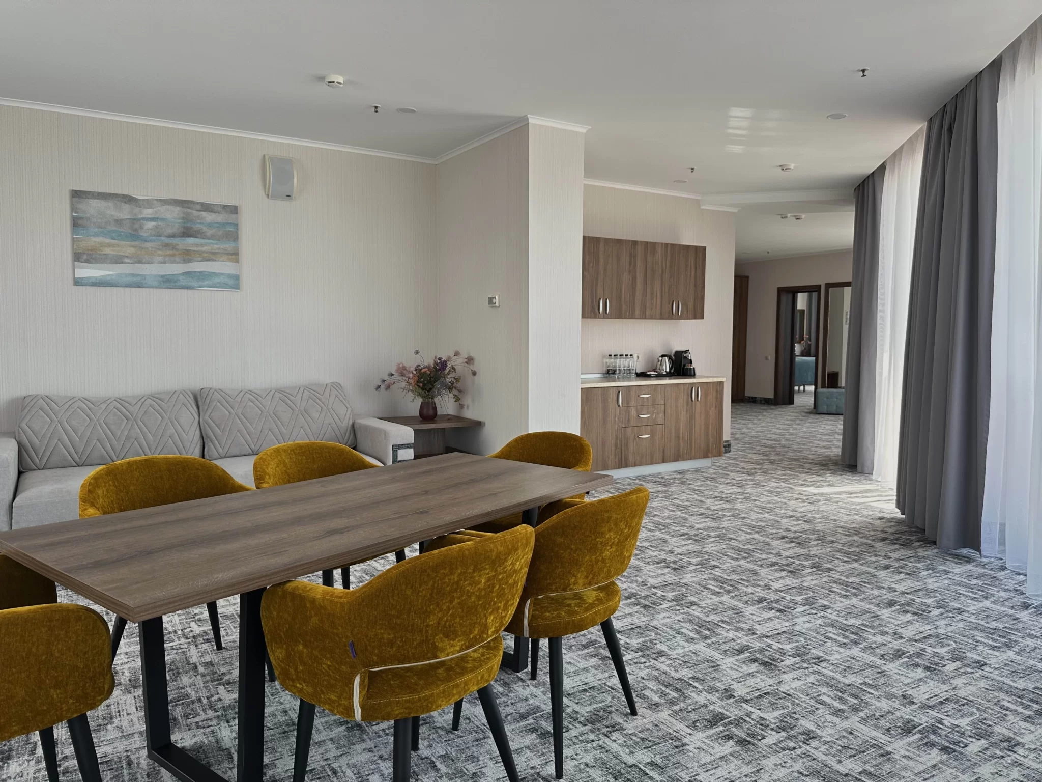 Номер площадью 250 кв. м. включает две спальни с кроватями «кинг сайз» и гостиную с обеденной зоной Каждая комната оснащена необходимой для идеального отдыха мебелью и современной техникой. Большая видовая терраса с джакузи и уютными качелями, несомненно, станет местом релакса и приятного отдыха.