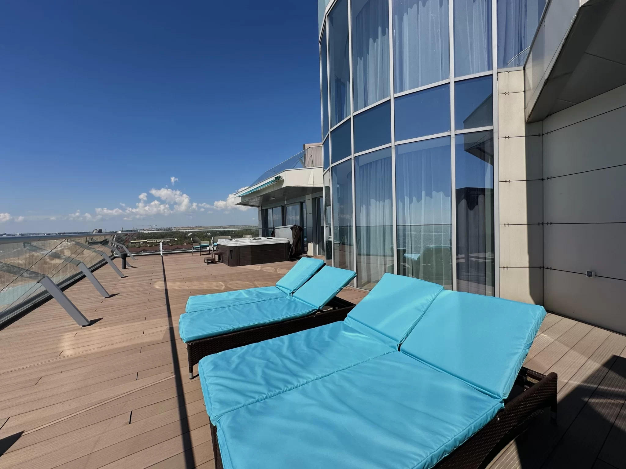 Изысканный интерьер апартаментов с террасой стоит того, чтобы остановить внимание на многочисленных деталях. Светлые оттенки стен и текстиля элегантно подчеркивают предметы мебели из натурального дерева или обивку цвета морской волны.
