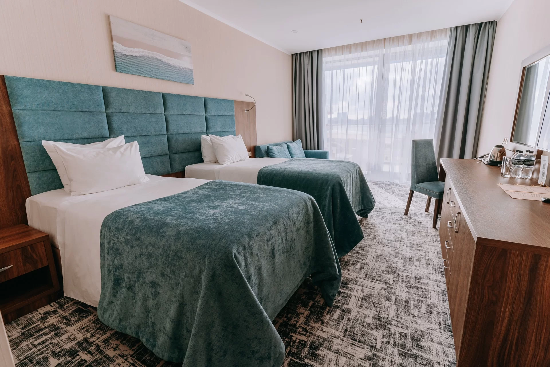 В номере есть всё для уютного и комфортного пребывания: две односпальные кровати с ортопедическими матрасами, шторы «блэкаут» для крепкого сна даже в самый солнечный день, чайник и набор для приготовления чая и кофе. Здесь хочется остаться подольше и прочувствовать каждую минуту безмятежного отдыха.